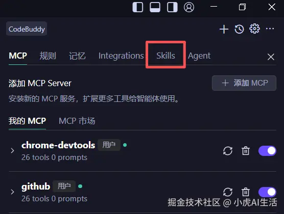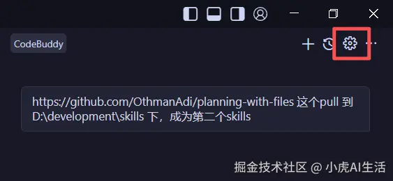 - 看向 codebuddy 聊天窗口的 右上角,有一个不起眼的 ⚙️(齿轮图标) 。
