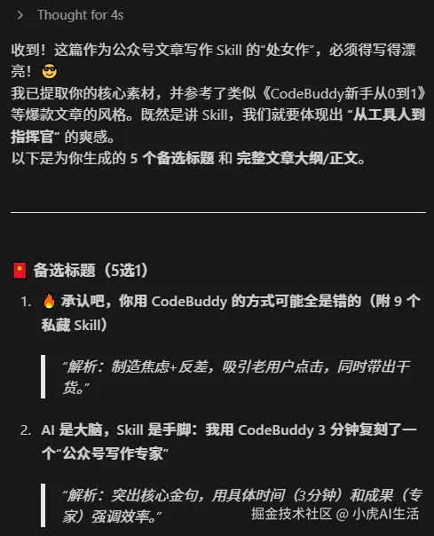 我只是告诉它:“我要写一篇关于 Skills 的文章,素材有这些……” 它自动调用了我的历史文章库,学习了我的语调,甚至连这句“嘿嘿”都是它学来的。
