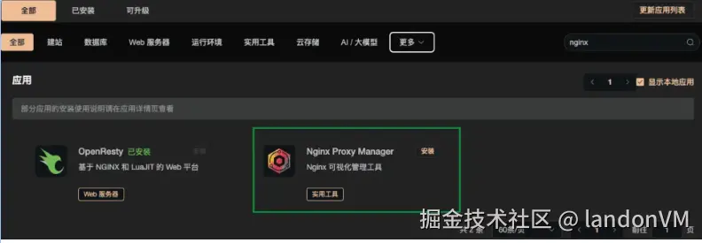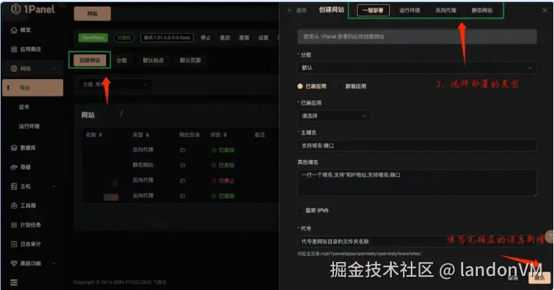 在宝塔面板上,我使用的是 nginx 进行反向代理,而在 1panel上需要使用 openResty 才可以在网站选项添加站点。当然,你也可以不用 openResty,直接通过 nginx 的配置文件进行站点的添加,但是这样稍微比较麻烦一点,我看到 1panel 的官方应用商店里有一个 nginx 可视化管理工具,可以可视化操作 nginx 部署的站点。既然使用了 1panel ,那就直接使用 openResty 吧!这样会更简单些。