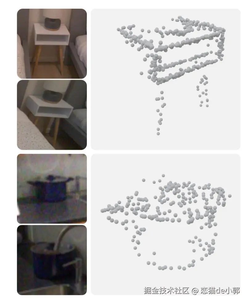 - 稀疏点云:相当于你在物体上撒了一把荧光粉,SLAM 并不试图重建整个物体表面,它只抓取最明显的特征点(比如桌角、杯子的把手尖),看起来稀稀拉拉像个幽灵,但它锁定了物体的真实尺寸和空间位置