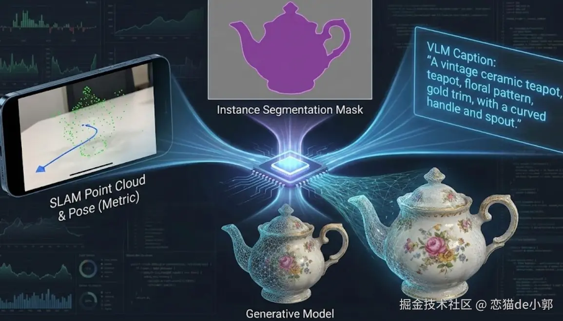 - VLM 生成的文本 caption(描述物体),把这些多模态条件喂给生成模型,最后得到物体的 metric 3D mesh(带真实尺度)