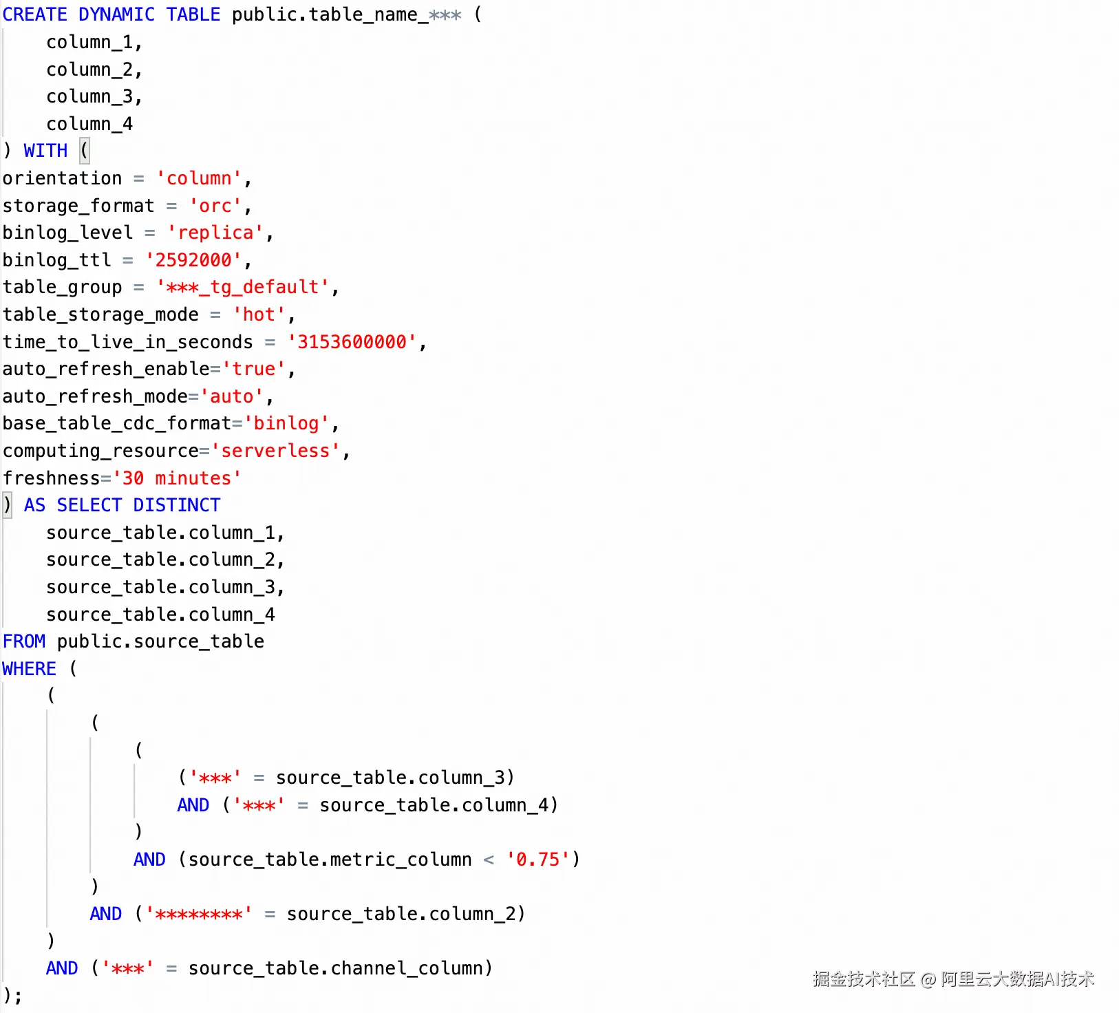 Dynamic Table完美符合场景要求:工程基于不同的筛选规则翻译成相应的DQL,并根据业务场景的需求灵活设置数据新鲜度等配置参数,最终生成完整的Dynamic Table DDL。