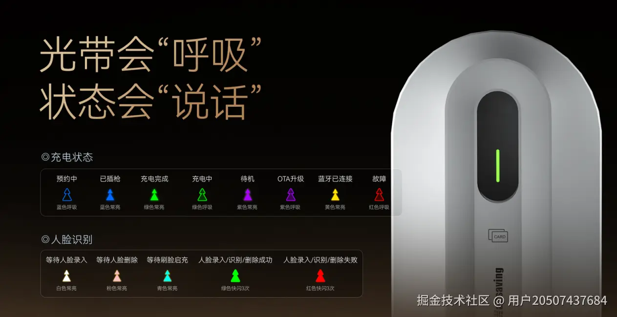 - 状态一眼即知:你也不用费心去查看手机APP确认是否充上电。其独特的 光感呼吸灯带,会用直观的灯光语言与你沟通:当灯带呈现舒缓的 绿色呼吸 效果时,就代表爱车正在稳定补充能量。一切状态,一目了然。