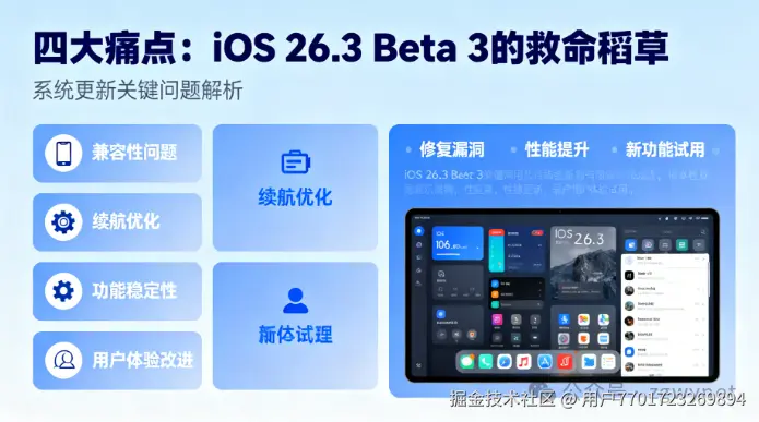 对于已经在使用iOS 26.3测试版的用户,iOS 26.3 Beta 3更新是必选项。这个版本有望解决微信卡死、游戏掉帧、待机耗电和信号波动等关键问题,为日常使用带来显著改善。