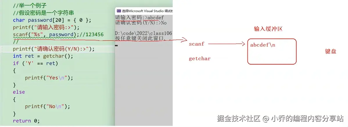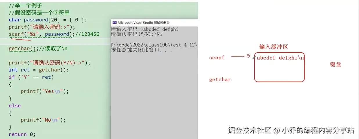int res = getchar();//拿到的是输入密码后按的回车键\n,所以会直接打印NO