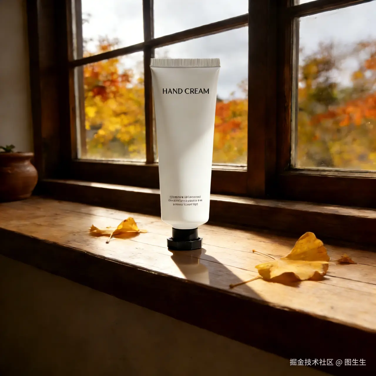 ✔效果图: 护手霜稳稳置于木质窗台,形成自然阴影与窗台贴合。与金黄银杏叶错落呼应,银杏叶的光影落在瓶身侧面,整体画面和谐统一,温柔秋日氛围感拉满,彻底消除生硬拼贴感,质感细腻高级。