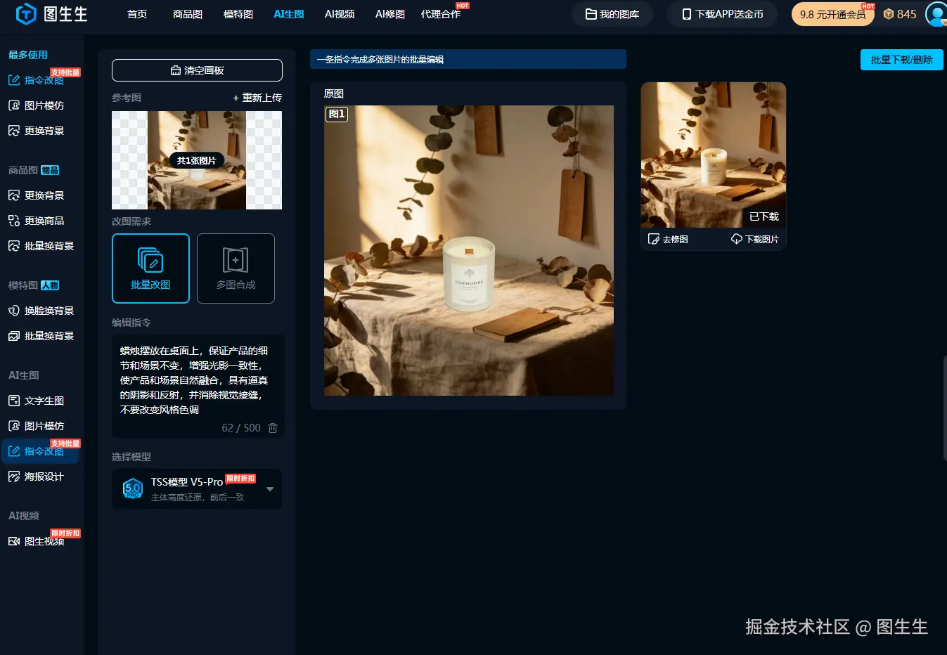 AI改图功能完美解决,上传生硬拼贴图,一句溶图指令,就能让产品精准适配场景光影、无缝融入,小白也能轻松出高级感。