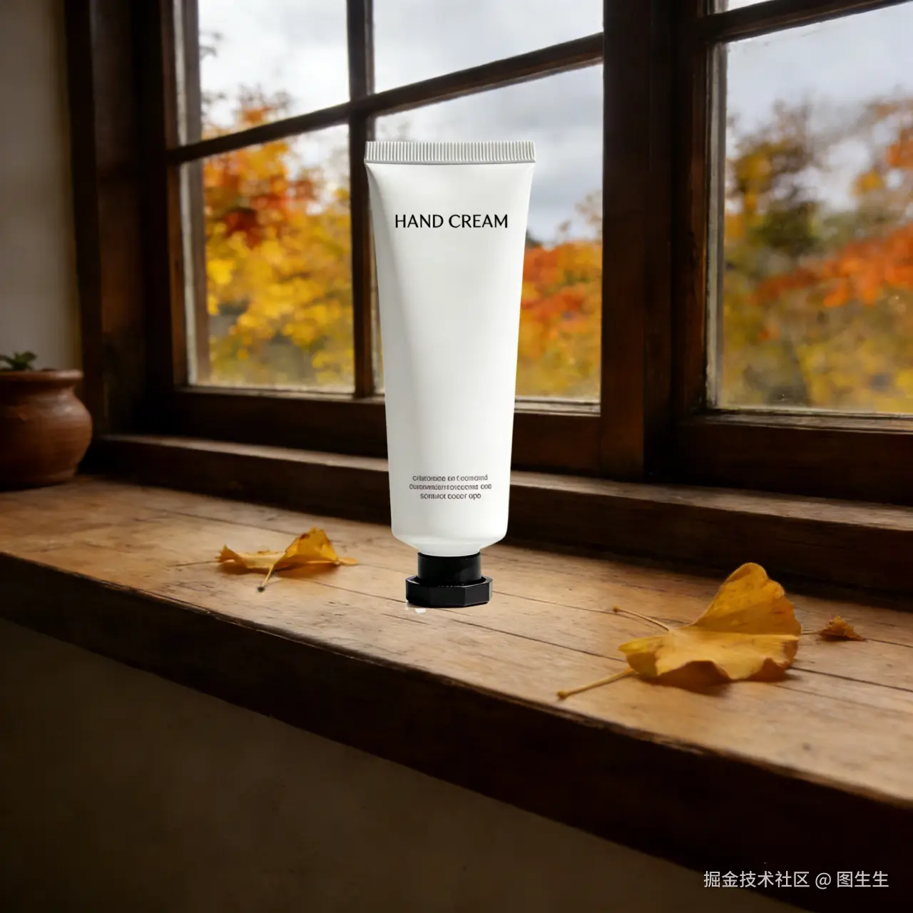 ▷原图: 护手霜生硬叠加在秋日窗台背景的拼贴图,护手霜太过突兀,无阴影、边缘生硬,和背景中的落叶毫无融合感,合成痕迹过重。