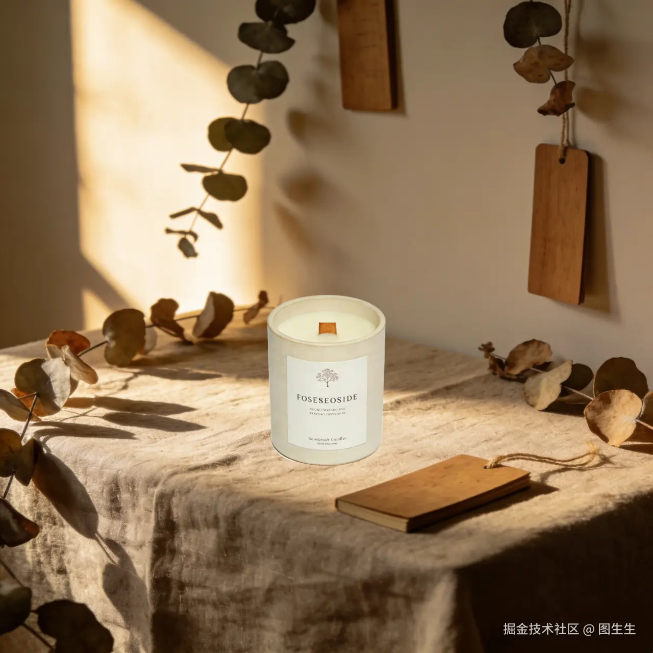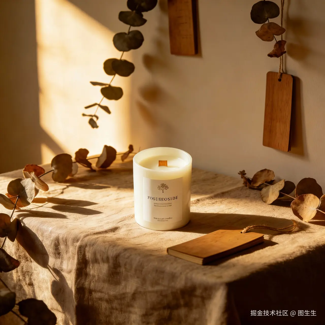 ✔效果图: 香薰蜡烛与桌面形成自然贴合质感,光影自然,无任何拼贴痕迹。暖棕系色调与干枯尤加利叶、木质书签呼应,森系治愈感拉满,质感堪比实地拍摄大片。