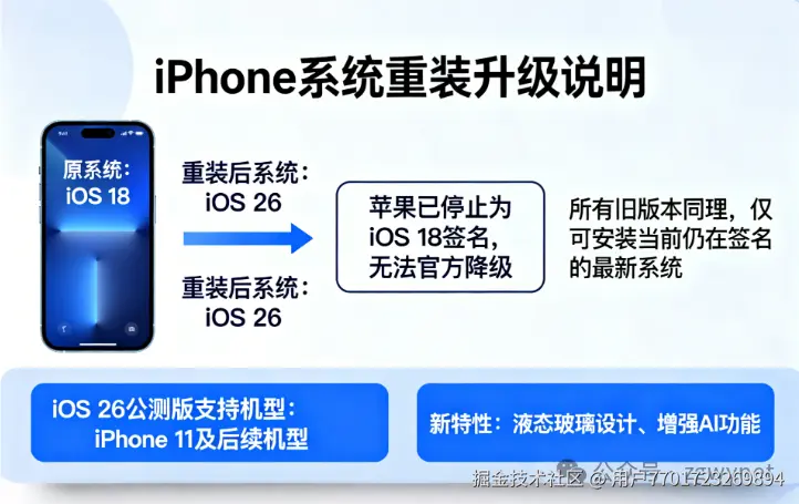 一个关键提醒:如果你的iPhone原本运行iOS 18,重装后安装的将是iOS 26。这是因为苹果已经停止为iOS 18签名,这是苹果控制固件安装的常规做法。