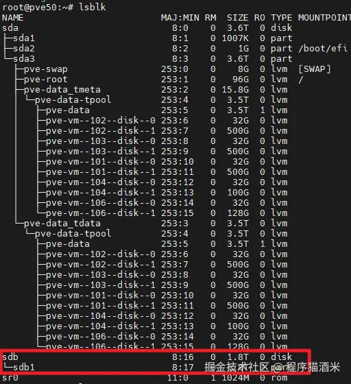 - 插入硬盘后使用lsblk命令列出所有块设备
