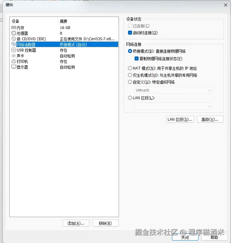 网络适配器->网络连接->桥接模式下,要勾选“复制物理网络连接状态”