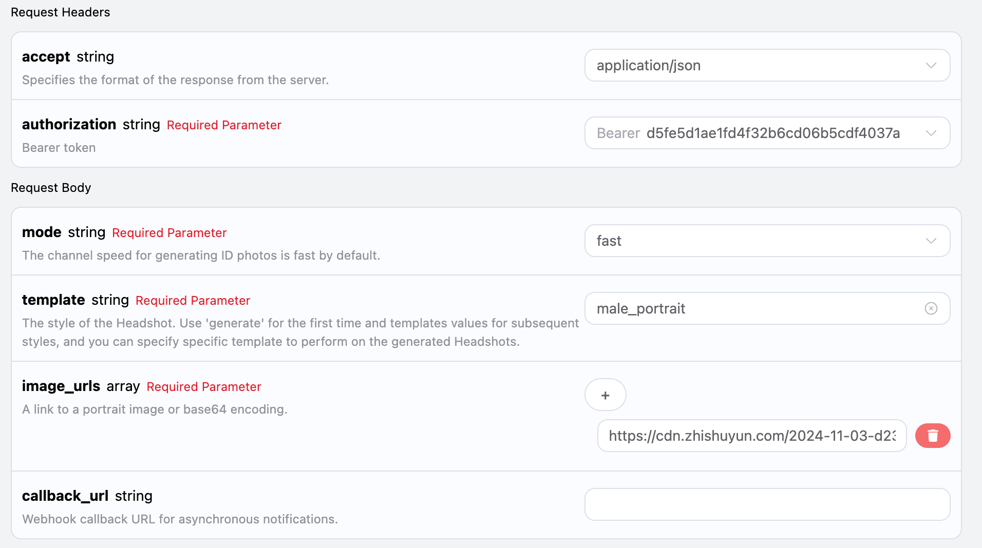 mode:生成证件照的通道,主要有fast快速和relax慢速俩种,当使用relax强烈推荐使用下面的参数callback_url。template:证件照模板的风格。image_urls:需要上传的证件照人像链接。callback_url:需要回调结果的URL。