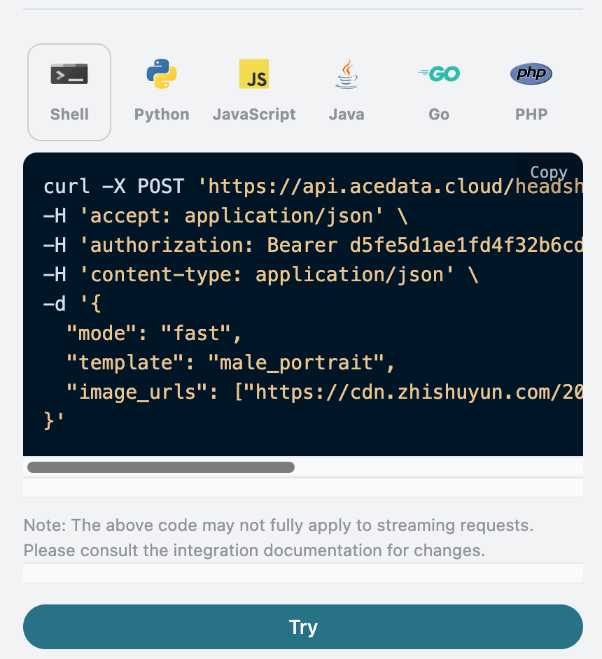 另外如果想生成对应的对接代码,可以直接复制生成,例如 CURL 的代码如下: