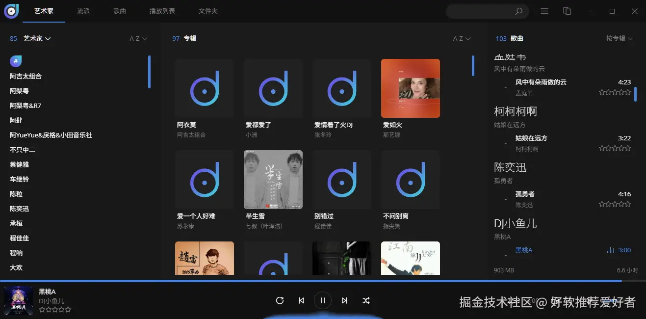 软件采用简约现代的界面风格,与新版 Windows 系统视觉适配度极高,布局清晰明了。核心模块涵盖艺术家、专辑、播放列表、文件夹等,同时支持 A-Z 字母排序查找功能,帮助用户快速定位目标歌曲,操作直观易懂,大幅降低使用门槛。
