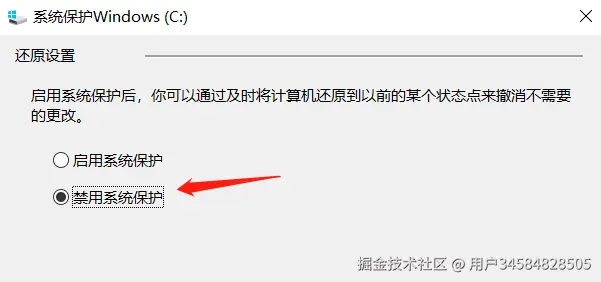Step3:在上方【还原设置】中,点击【禁用系统保护】,应用并确认。
