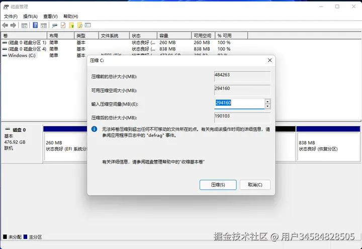 Step3: 弹出压缩窗口,在输入压缩空间量的地方,输入你想分出来的容量,点击【压缩】;