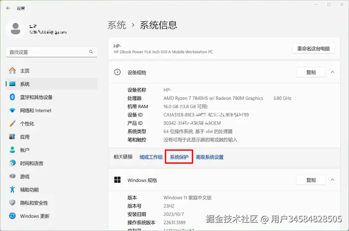 Step1: 打开【设置】-【系统】-【系统信息】,点击相关链接里的【系统保护】;