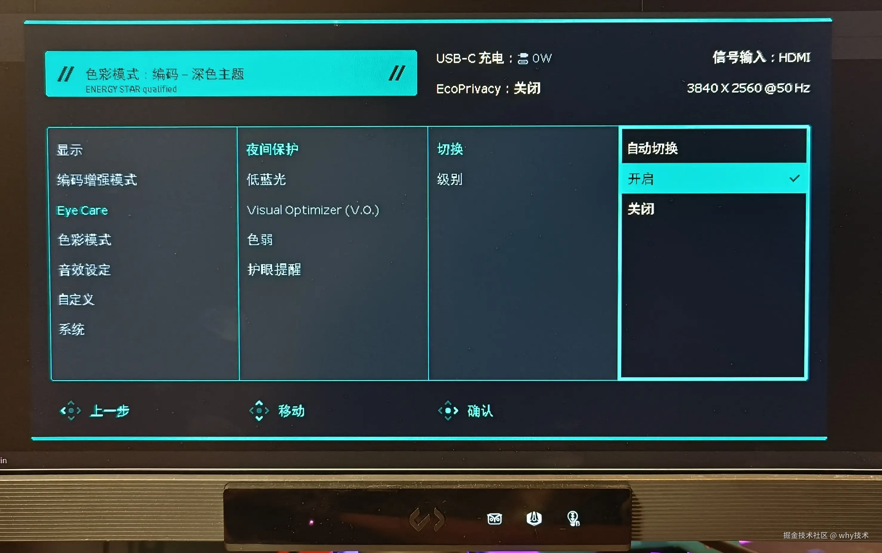 背后的原因正如官方介绍的一样,它具备智能环境光检测的功能,在当前的环境光的情况下,结合硬件层面的优化,提供舒适的眼睛保护: