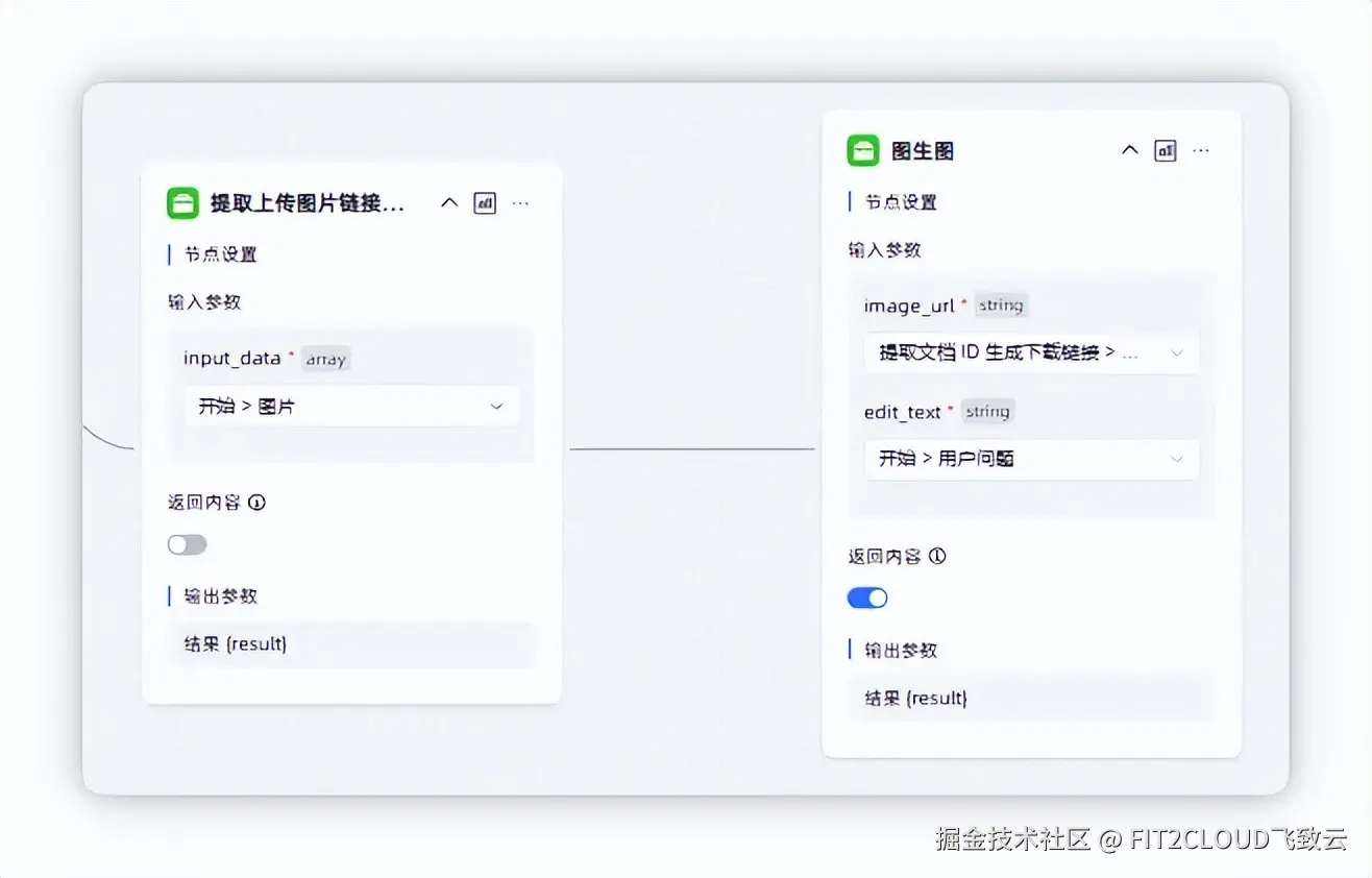 ② 二次编辑处理: 如果用户继续对已生成的图像提出编辑需求,系统则从变量中提取对应的图片链接,并将其作为输入传递给图生图/图片编辑组件,从而实现对文生图结果的进一步修改和优化。