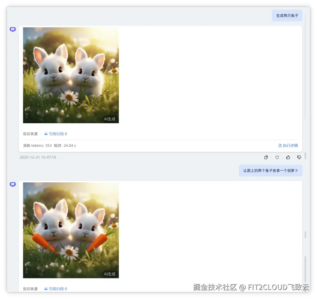 2. 文图编辑融合效果示例: 通过提示词“生成两只兔子”实现文生图,然后再次输入提示词“让图上的两个兔子各拿一个胡萝卜”,对第一次文生图的结果进行二次修改。