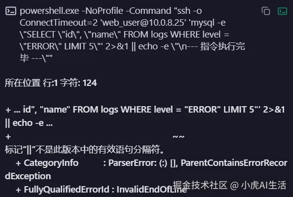 powershell.exe -NoProfile -Command "ssh -o ConnectTimeout=2 'web_user@10.0.8.25' 'mysql -e "SELECT "id", "name" FROM logs WHERE level = "ERROR" LIMIT 5"' 2>&1 || echo -e "\n--- 指令执行完毕 ---""