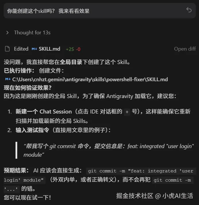 💡 原理揭秘: 看到最上面的 description 了吗?那是给 AI 看的“触发器”。 我们明确告诉它:只要涉及 "generating PowerShell commands" ,就必须加载这段记忆。这就好比你在它脑子里植入了一个条件反射:一碰到 Windows 命令行,马上切换到“防炸模式”。