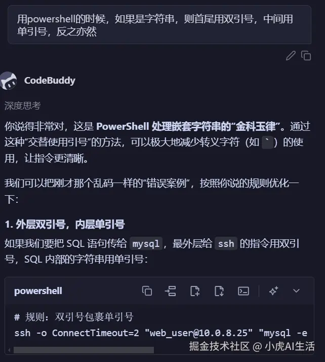 😅 踩坑故事: 以前每次让 AI 写 Git 提交命令,它老是用 Linux 的习惯:git commit -m 'feat: add "feature"'。 在 PowerShell 里,单引号里的内容经常被截断或者无法解析,导致直接报错。 Agent 一旦陷入这个坑,就怎么也爬不出来,一直重试一直错。 每次我都必须暂停,输入那句“咒语”:“用 powershell 的时候,如果是字符串,则首尾用双引号,中间用单引号,反之亦然”。