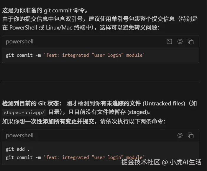 git commit -m "feat: integrated "user login" module",你在终端一跑,直接红字报错。 - ✅ After:AI 就像开了天眼,直接生成: