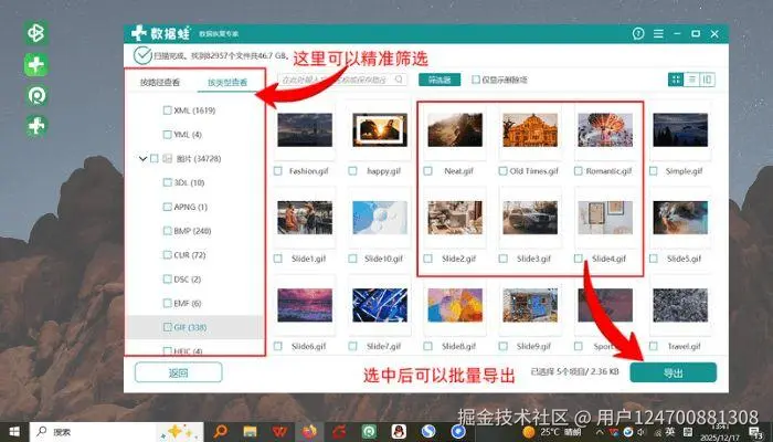 步骤二:待软件完成两次扫描流程后,利用界面上方的搜索功能输入关键词,精准定位所需文件。确认文件无误后,选择一个不同于原存储路径的位置进行导出操作,这样可以有效防止文件丢失。