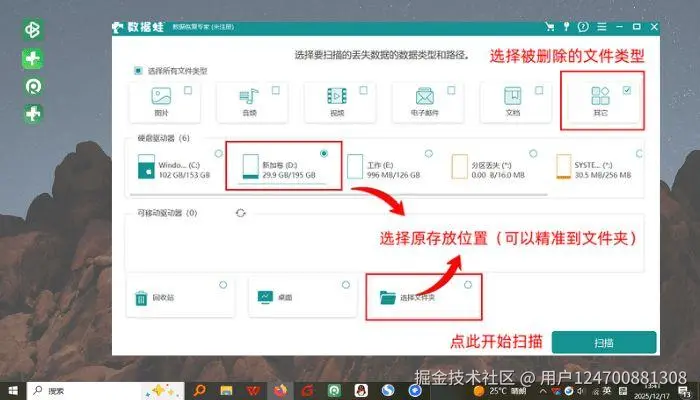 步骤一:进入软件主界面后,先选定需要恢复的隐藏文件类型,同时指定文件原本的存储位置,随后点击开始扫描按钮。