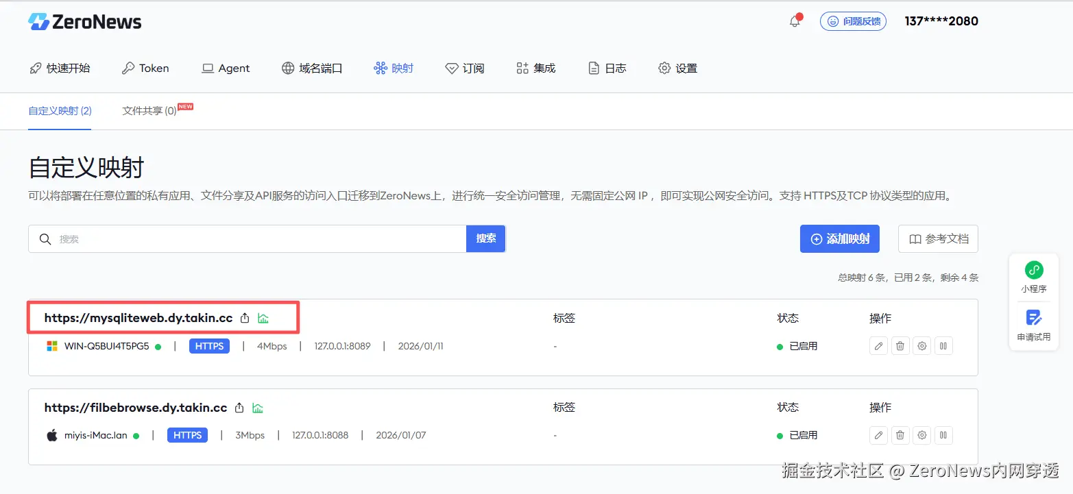 5. 照上述步骤创建完成之后,我们就可以得到一条可公网访问的映射域名
