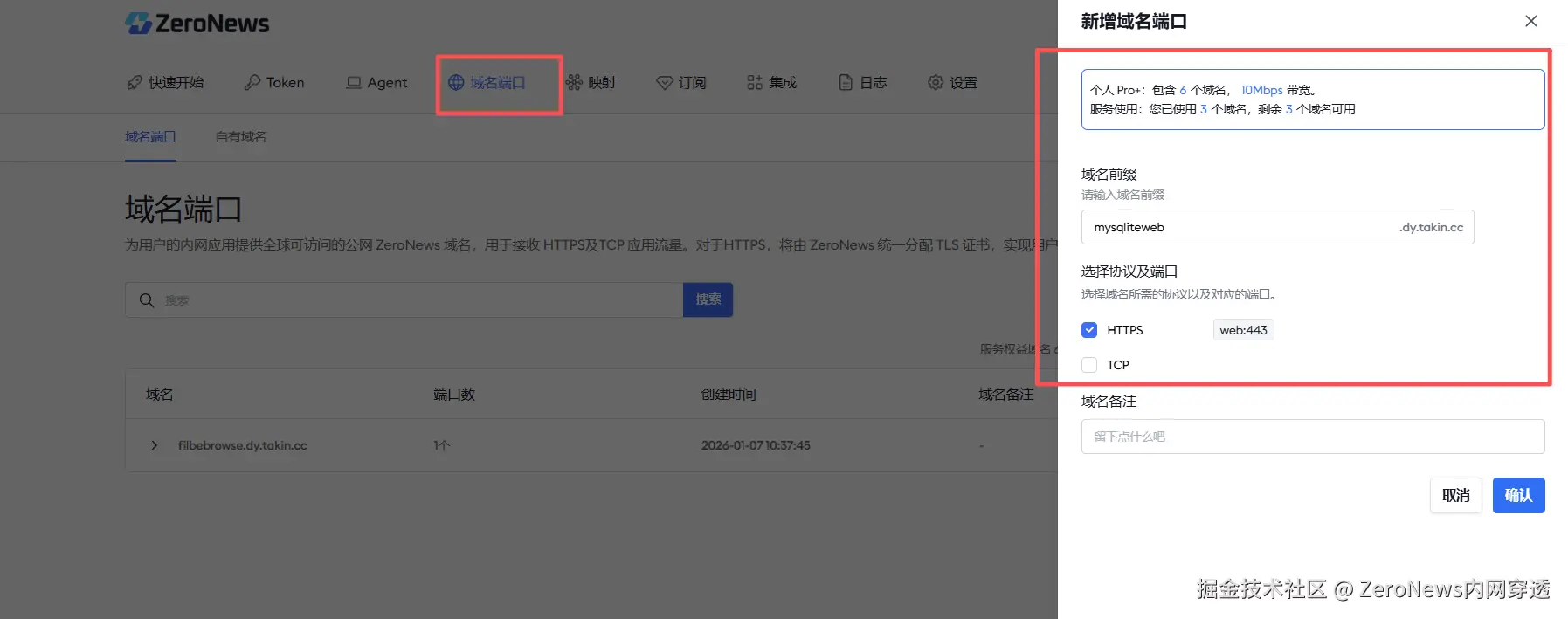 3. 接着,我们在域名端口页面,创建一个可用的公网域名(自定义前缀),并勾选HTTPS 协议端口。