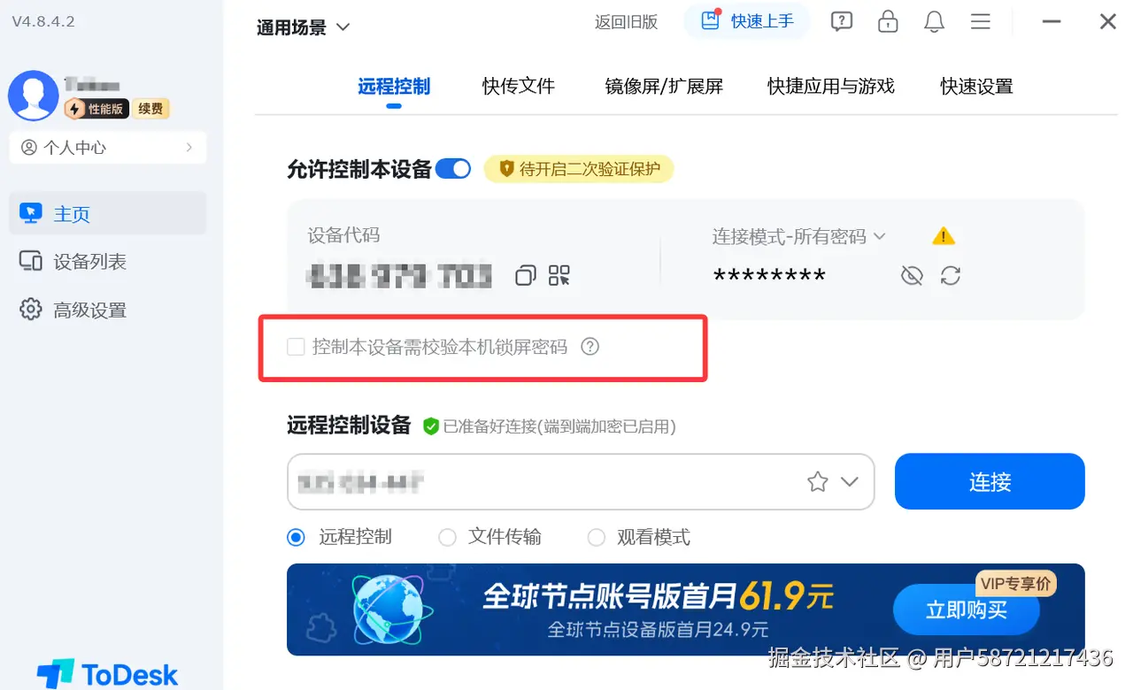 ToDesk还能够支持控制设备后需要使用设备的锁屏密码的功能,这个功能也是非常强大的,有时候远程控制码和密码不小心泄露了,假如你开启了这个功能的话,那么还有电脑屏幕密码这一层防护,可以让远程控制更加安全。