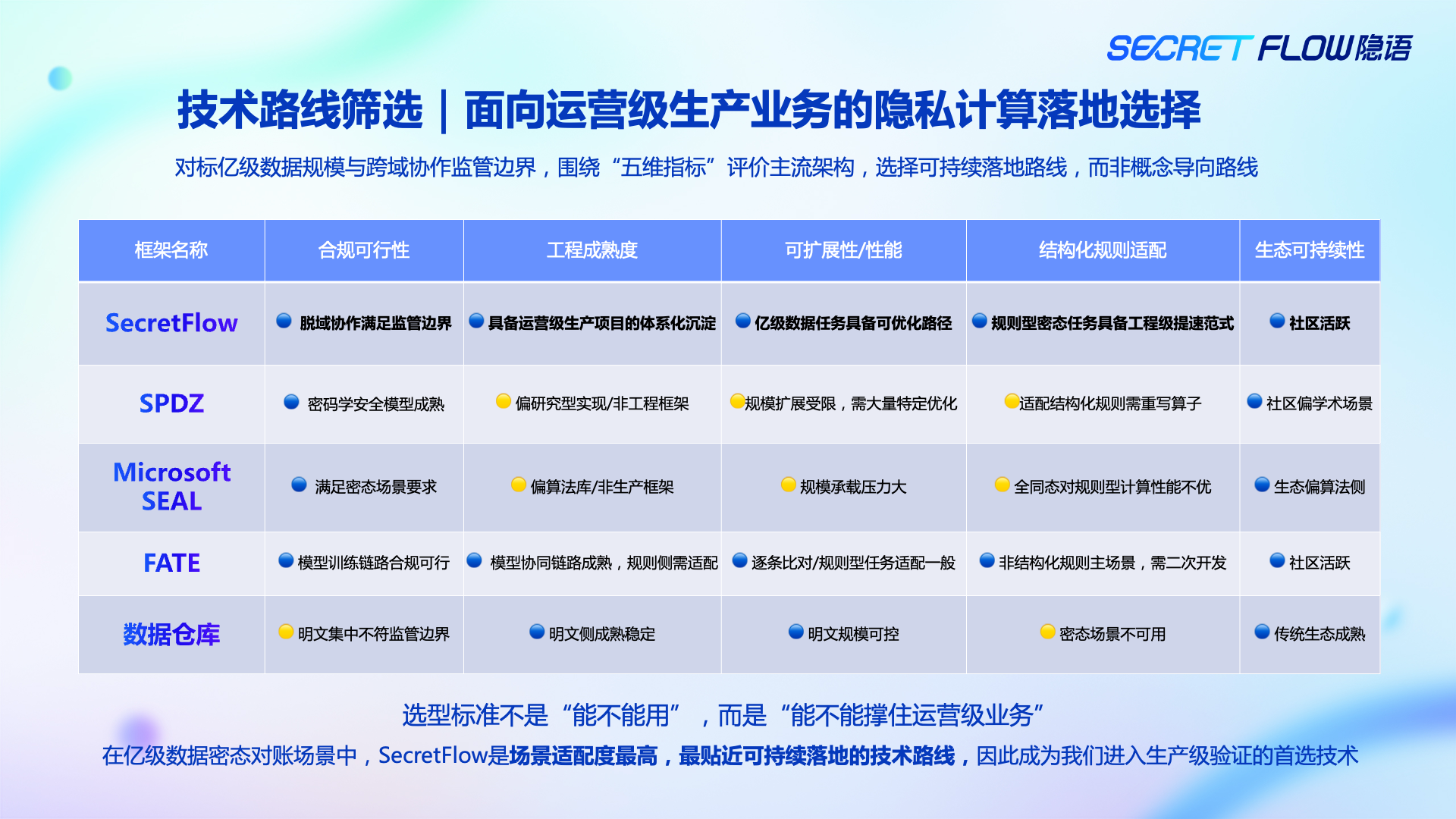 正因为如此,我们在技术选型阶段,并没有把问题定义为“用不用隐私计算”,而是明确了一条更严格的原则:不是“能不能用”,而是“能不能长期跑在运营级业务中”。