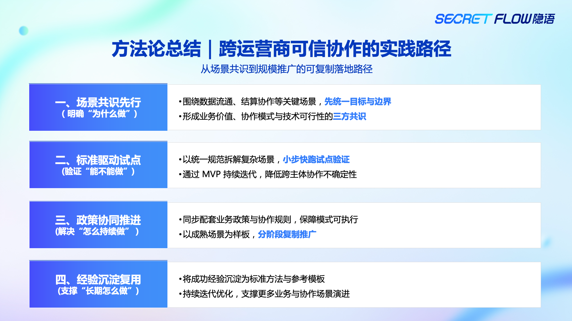 - 场景共识先行:先把“为什么协作、协作边界在哪、各方收益是什么”讲清楚;