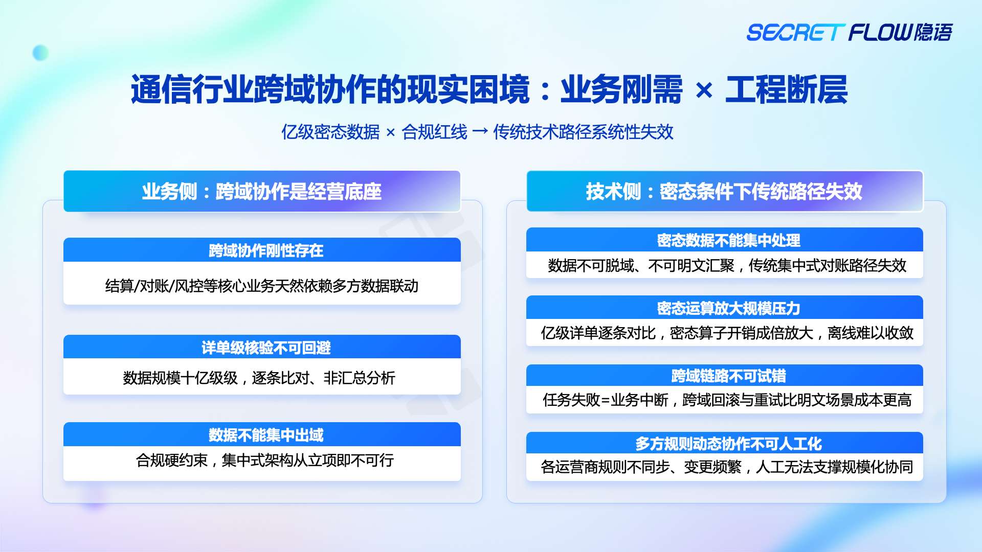 当这些因素叠加到通信行业,问题被进一步放大:亿级数据规模 + 跨域协作刚需 + 合规红线不可突破,使得传统集中式技术路径开始系统性失效。