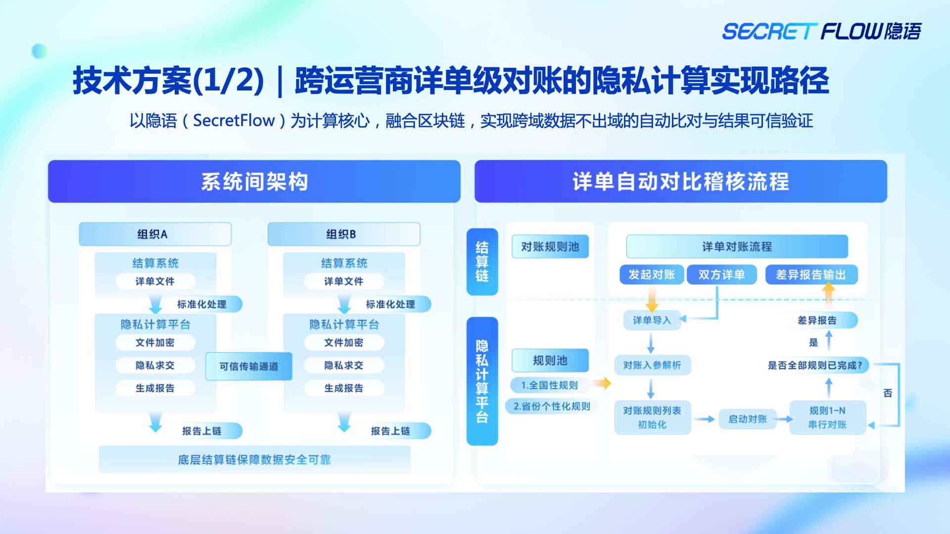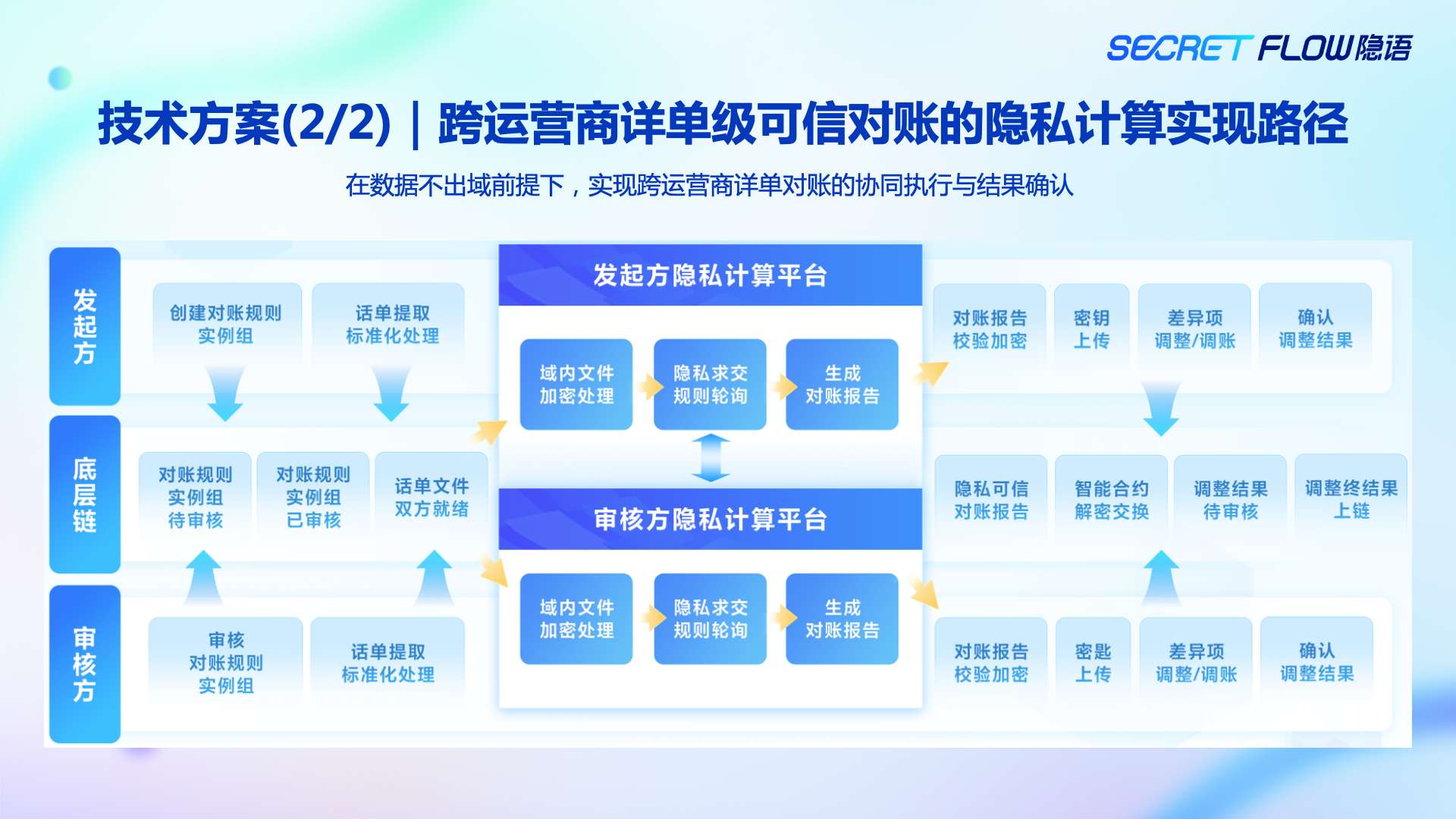 - 2023 年初:详单级对账需求出现,传统集中式方案在合规层面全面受限,开始引入SecretFlow,探索“原始数据不出域”的可行路径;