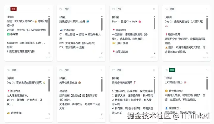 •第二步:生成文案大纲。AI 会自动为你拟好吸睛标题、正文描述,并拆解出每一张图的排版文案。在这个环节,你可以根据自己的语感进行微调。
