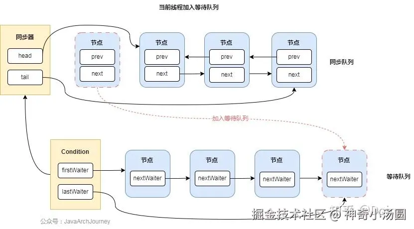 当前线程(已获取到同步锁)调用 Condition 的 await() 方法(或者以 await 开头的方法),会使当前线程构造新节点加入等待队列尾部,并释放同步锁,唤醒同步队列中的后继节点,然后当前线程会进入等待状态。