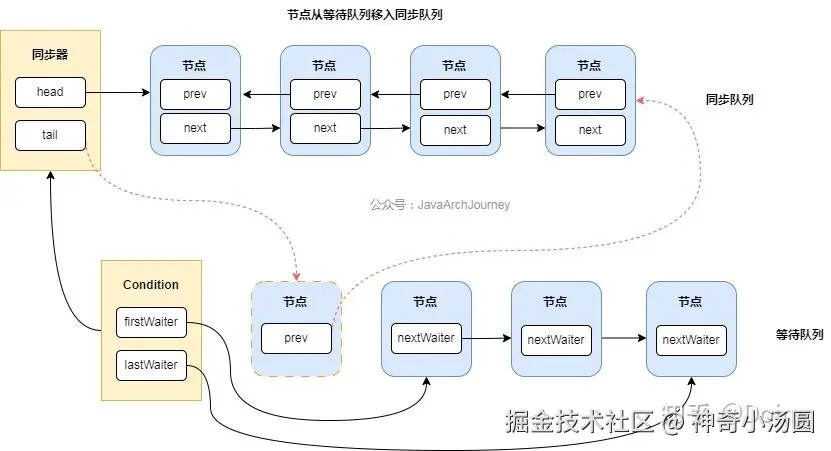 从队列(同步队列和等待队列)的角度看 await() 方法,相当于同步队列的首节点(获取了锁的节点)移动到Condition 的等待队列尾部。