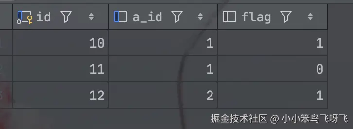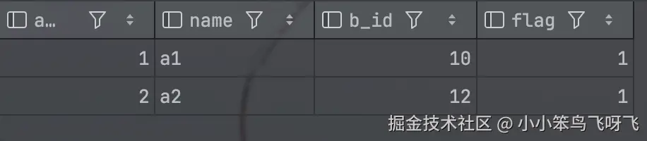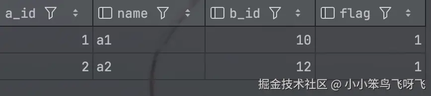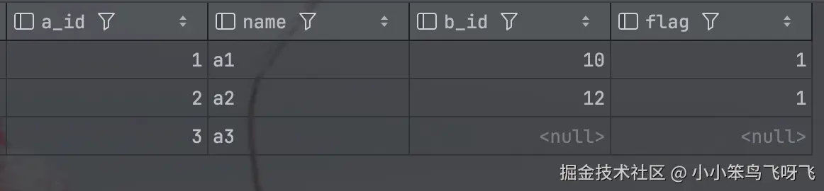 | left join | B表查询条件放在 on | select A.id as a_id, A.name, B.id as b_id, B.flag from A left join B on A.id = B.a_id and B.flag = 1 order by A.id; | B.flag = 1 只决定能不能 join 到 B。 A.id=3 没有匹配,仍然保留 |