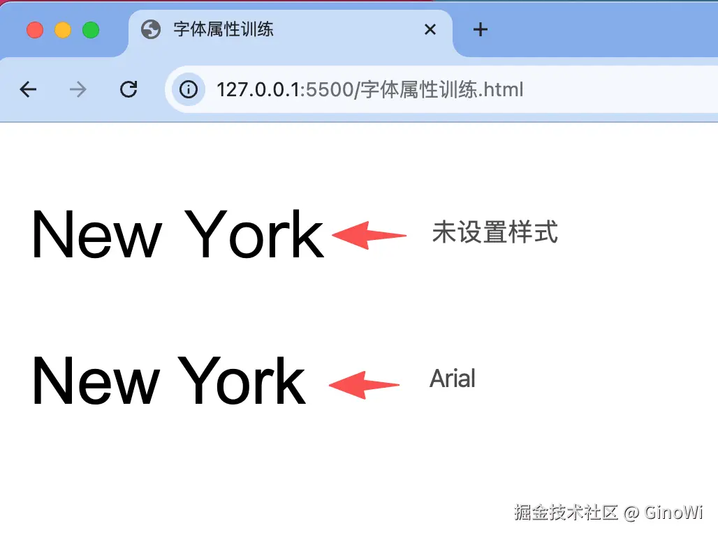 <!DOCTYPE html> <html> <head> <meta charset="utf-8"> <title>字体属性训练</title> <style type="text/css"> .setArial { font-family:'Arial'; } </style> </head> <body> <p class="non">New York</p> <p class="setArial">New York</p> </body> </html>