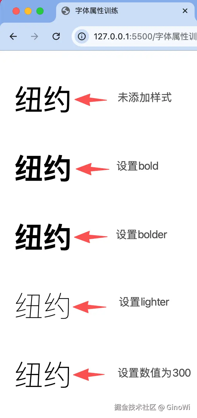 <!DOCTYPE html> <html> <head> <meta charset="utf-8"> <title>字体属性训练</title> <style type="text/css"> .setBold { font-weight: bold; } .setBolder { font-weight: bolder; } .setLighter { font-weight: lighter; } .setNumber { font-weight: 300; } </style> </head> <body> <p class="non">纽约</p> <p class="setBold">纽约</p> <p class="setBolder">纽约</p> <p class="setLighter">纽约</p> <p class="setNumber">纽约</p> </body> </html>