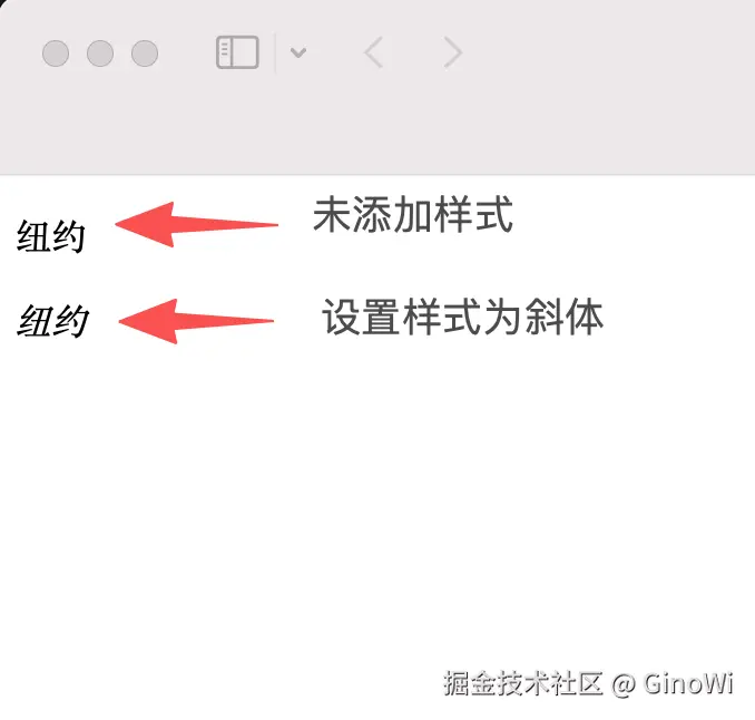 <!DOCTYPE html> <html> <head> <meta charset="utf-8"> <title>字体属性训练</title> <style type="text/css"> .setItalic { font-style: italic; } </style> </head> <body> <p class="non">纽约</p> <p class="setItalic">纽约</p> </body> </html>