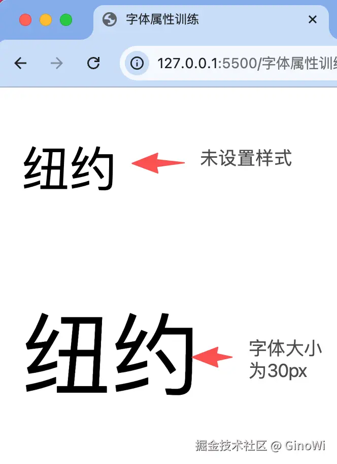 <!DOCTYPE html> <html> <head> <meta charset="utf-8"> <title>字体属性训练</title> <style type="text/css"> .set30 { font-size: 30px; } </style> </head> <body> <p class="non">纽约</p> <p class="set30">纽约</p> </body> </html>