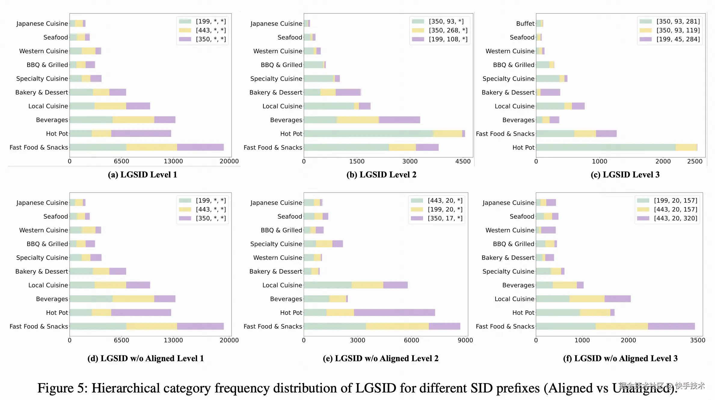 下图对比了在是否引入 G-DPO 对齐的条件下,LGSID 分层量化模型所生成的 SID 分布。由于第一层基于预先计算的地理特征聚类,其在对齐与未对齐设置下的整体分布保持相对一致。然而,在引入 G-DPO 对齐后,如下图 (b) 所示,第一层 Token([350, 93, *])能够将 BBQ & Grilled 品类完整地聚合至同一粗粒度标识之下;而在未对齐条件下,如图(e)所示,该品类则被分散映射到多个不同的 SID 根节点,导致类别一致性受损。上述现象表明,上游 LLM 表征的对齐质量直接影响分层量化结构的有效性,进一步突显了 G-DPO 在 LGSID 框架中的关键作用。