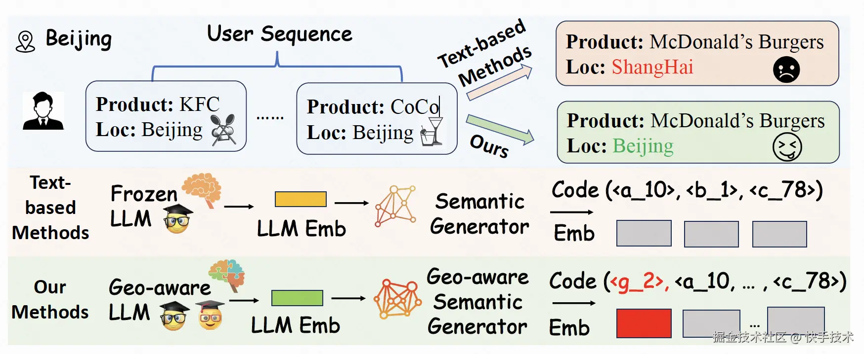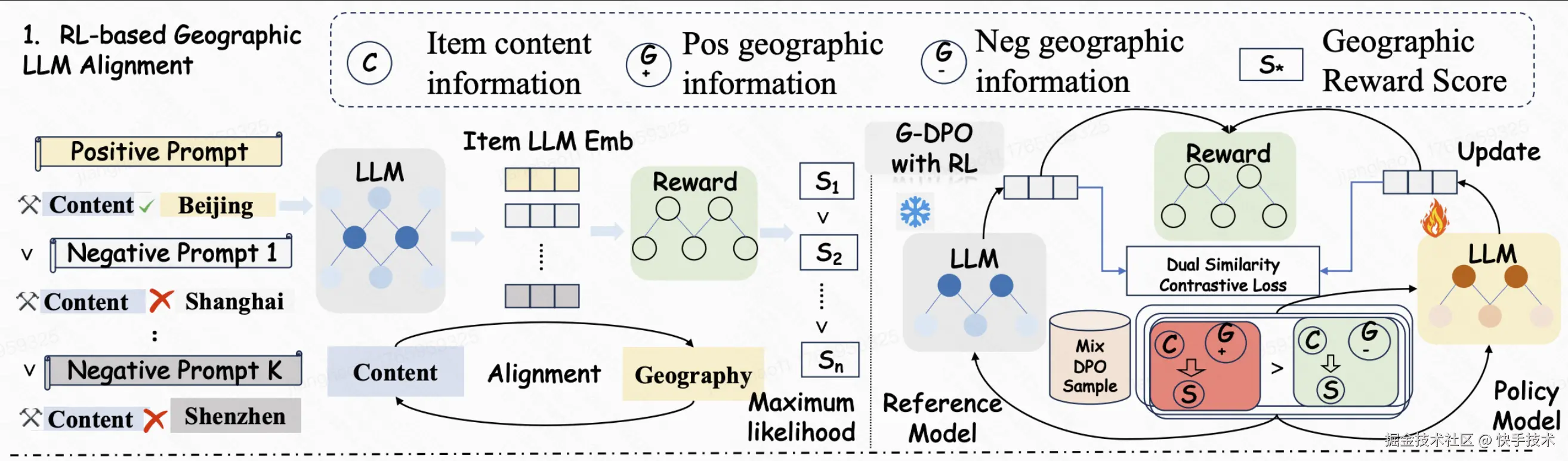 为应对生活服务推荐模型在空间感知方面的挑战,快手生活服务算法团队引入大语言模型对 Item 进行高质量的文本语义与地理语义联合偏好建模,并通过基于强化学习的后训练范式,缓解预训练 LLM 中普遍存在的“重语义、轻地理”先天偏置,从而使内容表征更加充分地适配生活服务推荐场景。基于上述思路,快手生活服务团队提出了业界首个面向近场分发场景的地理模态表征建模解决方案——LGSID。