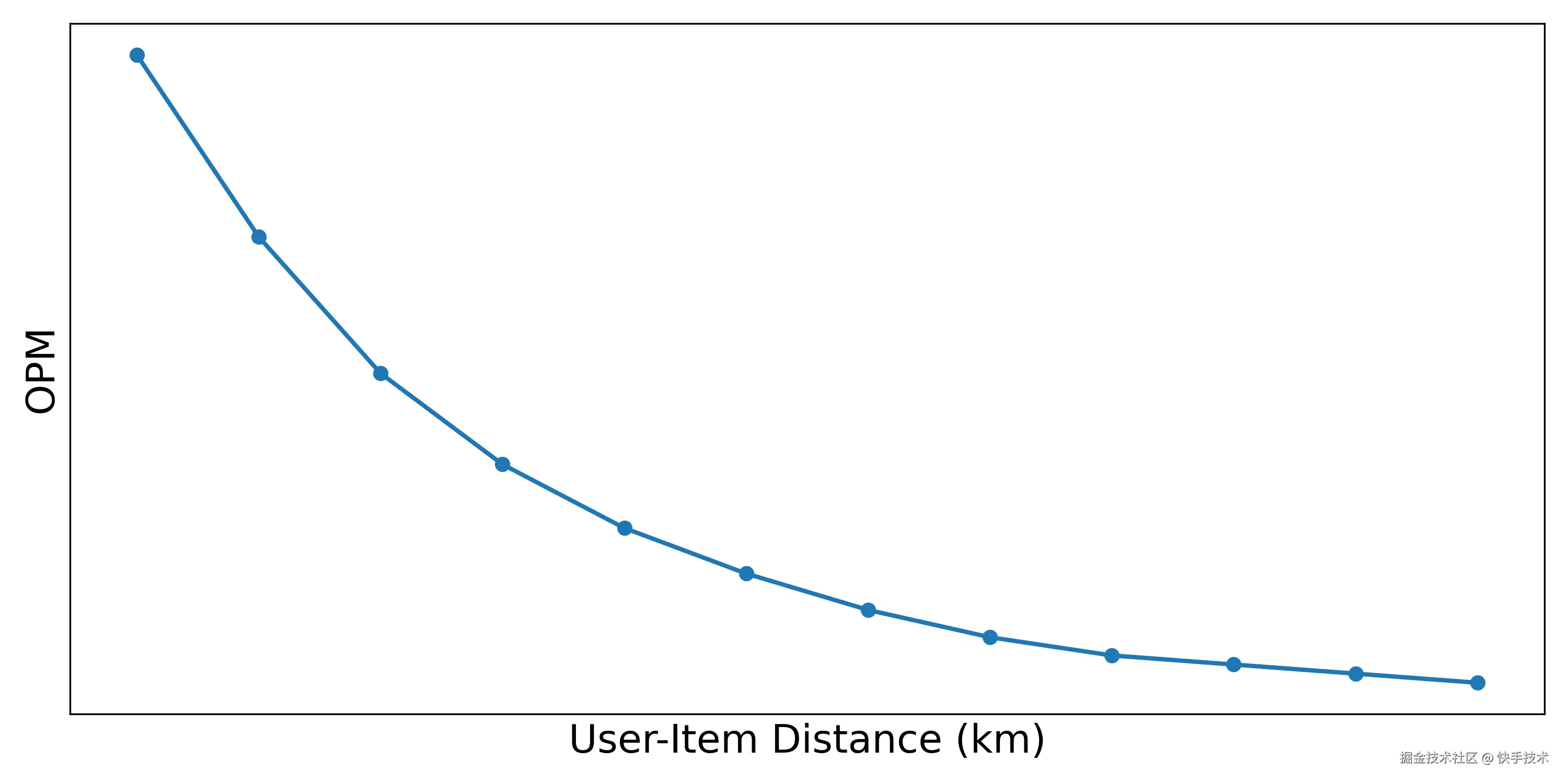在生活服务内容推荐场景中,业务核心逻辑是用户线上下单、线下到店核销。由于核销成本高,且强依赖用户与 Item 之间的地理位置关系,空间距离在该场景中对用户转化具有显著影响。如下图数据表明,**随着“人—货距离”的增加,用户转化效率明显下降。**因此,近场分发体系需要同时兼顾兴趣匹配准确性与空间感知能力。