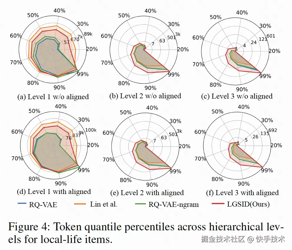 右图展示了不同分位点下不同量化方法产出 SID 的码本覆盖能力。结果表明,在 Level-1 层级中,LGSID 在对齐与未对齐两种设置下均呈现出高度一致的覆盖模式,在 90%分位点仍可保持约 11k 的覆盖能力,而 RQ-VAE 在相同条件下已衰减至约 8k。随着层级粒度进一步细化至 Level-2 与 Level-3,LGSID 的优势愈发明显,其在雷达图中的覆盖面积显著大于其他方法,表明其具备更强的表达容量以及更稳定的分布特性。